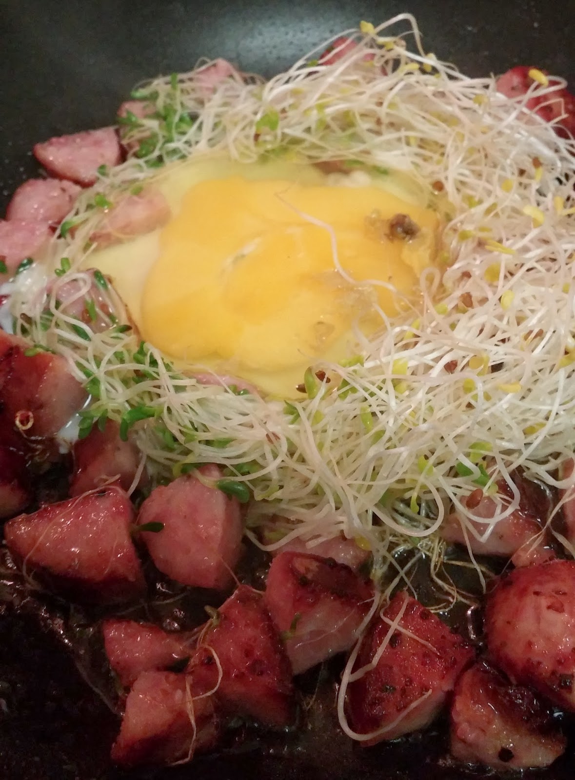 I absolutely love eating eggs, its just an added bonus that they are loaded with protien and I can cook them up with just about anything. This post is typical of what I eat any given day after I've tired of eating of sweet potatoes, chicken, and quinoa which I eat a lot of. Here it is: chicken sausage or turkey sausage as lean as you can get it, alfalfa sprouts and eggs. Top it off with some fage yogurt and I'm set!
